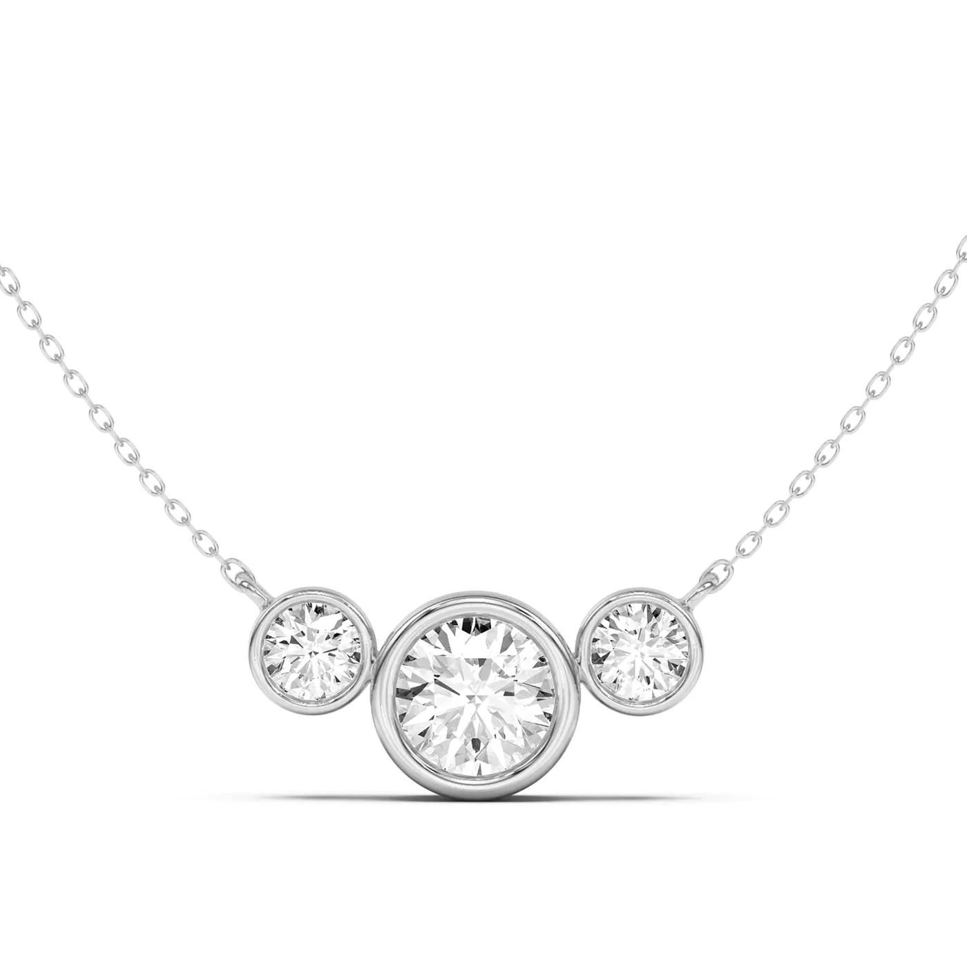 Add to cartClassic bezel three-stone design featuring quarter-carat diamonds on each side of the selected center, suspended from an 18-inch chain and secured with a lobster clasp.
